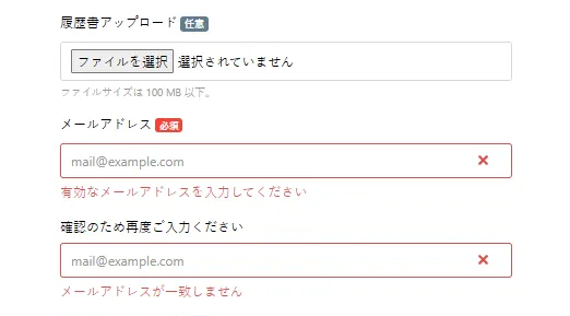 | 連絡先(電話・メール) | 応募者への連絡手段 | 電話番号・メールアドレス | ハイフン有無やメールの例を表示/自動返信メールと組み合わせてミスに気づける |