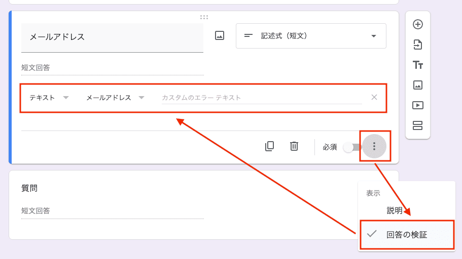 フォームの用途に応じてメールアドレスの回答する順番を変更したい場合は、手動で記述式の質問を設置し、右下の三点マークから「回答の検証」にチェックを入れて、回答方式をメールアドレスに限定させておきましょう。