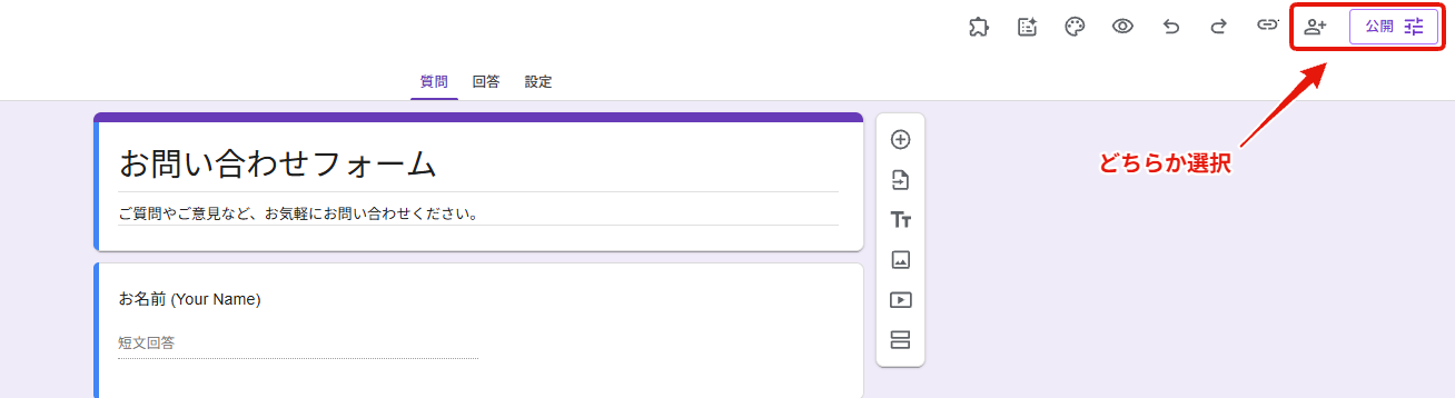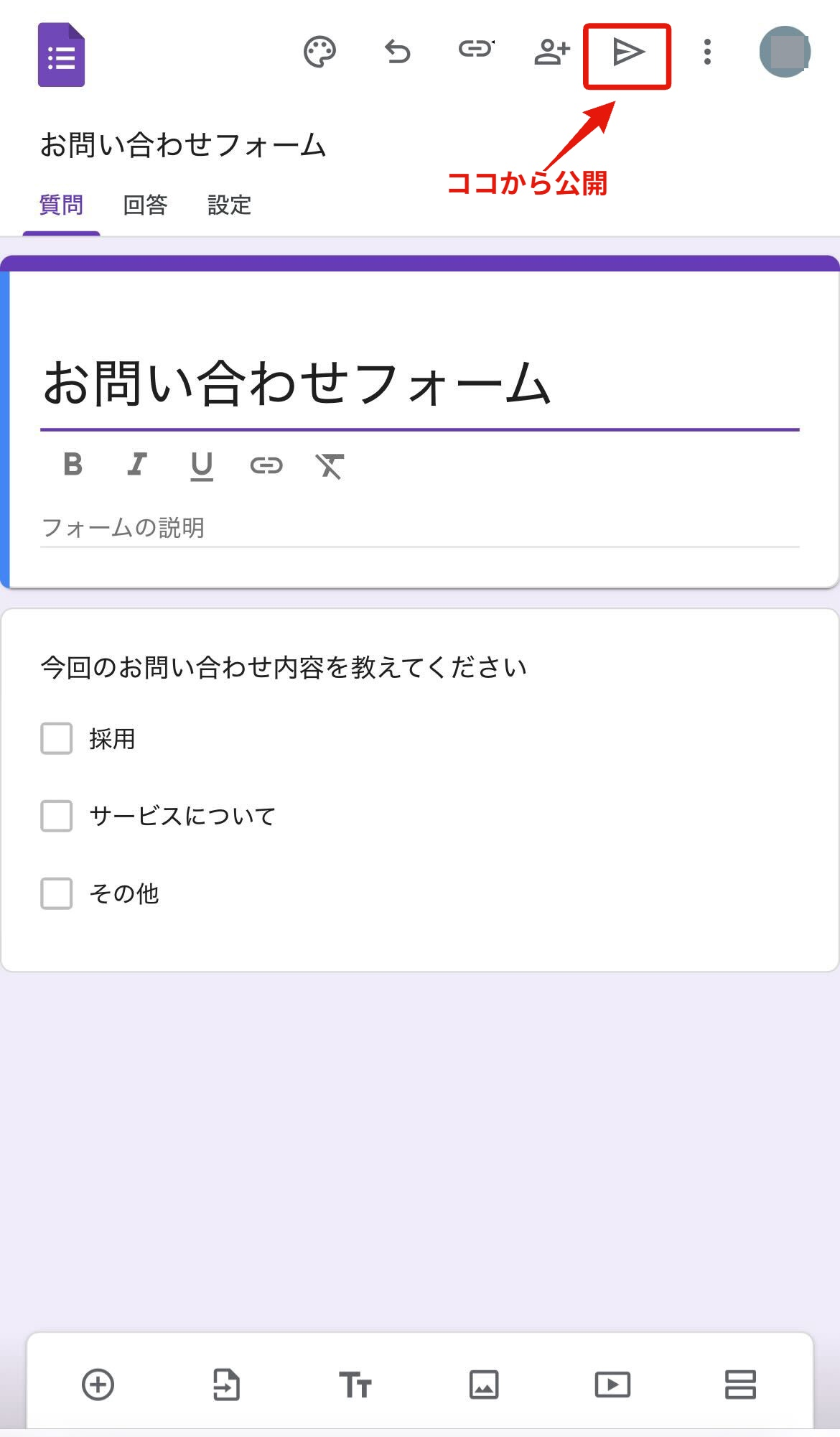 - Googleフォームの右上にある「送信」ボタンをクリック