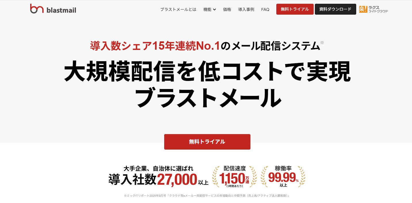 「blastmail」は、初心者からプロまで幅広く利用できるメール配信システムで、特に手軽に使えるのが特徴です。直感的に使えるHTMLエディターや、配信後の効果測定機能など、操作性と実用性を兼ね備えています。