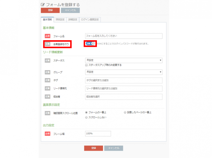 会員登録フォームは、通常フォームと同じ作成画面の基本情報ページ、「会員登録を行う」の項目でスライド式のボタンを【ONに変える】と作成できます。