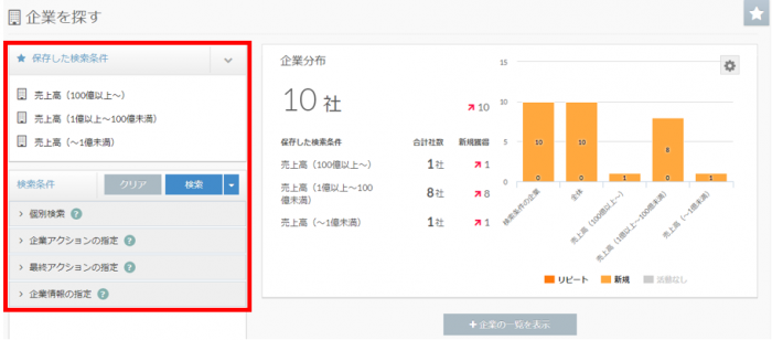 リード管理と同様、左側にある検索条件で企業情報を抽出することが可能です。