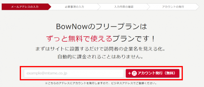 表示されたページでメールアドレスを入力し、【アカウント発行(無料)】をクリックします。