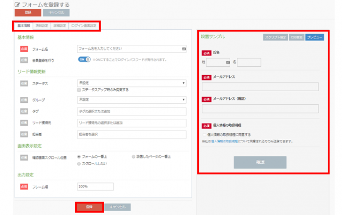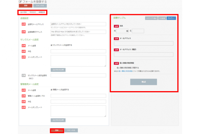 右側に表示されているプレビューを確認後、【登録】をクリックするとフォーム作成完了です。