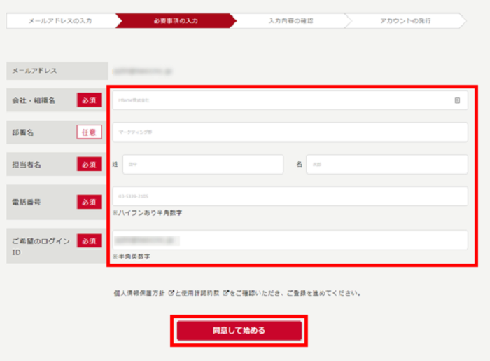 次のページで必要事項を入力し、【同意して始める】をクリックすると登録したアドレスにBowNowから「ライセンス仮登録のお知らせ」というメールが届くので、中に記載されてあるURLをクリックすると本登録が完了します。