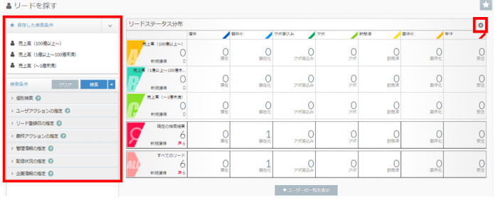 検索結果には、設定した検索条件とリードのステータスを軸にした一覧表(リードステータス分布)が表示されます。
