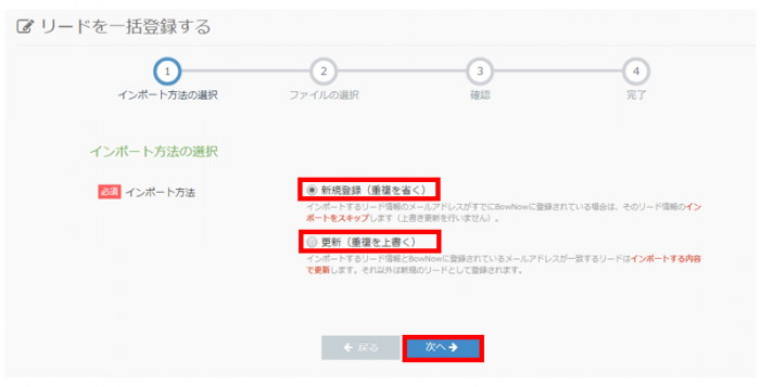 新規登録または更新のどちらかを選び、【次へ】をクリック。登録したいCSVファイルを選択してインポートすれば完了です。