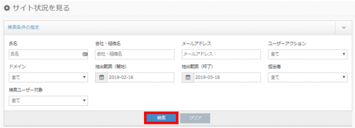 氏名や会社・組織名など、抽出したい条件を設定し検索すると、アクション日時や氏名、会社・組織名、アクションの内容などの情報が一覧で表示されます。