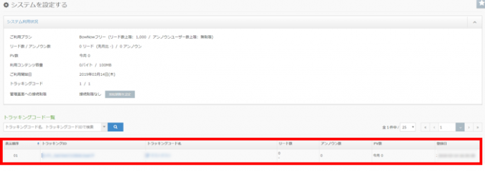 登録が完了すると、システム設定の画面にトラッキングコード一覧が表示されます。