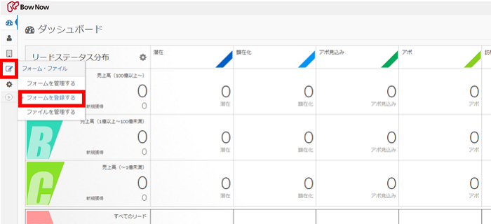 フォームを作成するには、左側にあるメニューの上から4つ目(えんぴつマーク)の【フォーム・ファイル】にマウスのカーソルを当てて表示されたメニューの中から、【フォームを登録する】をクリックします。