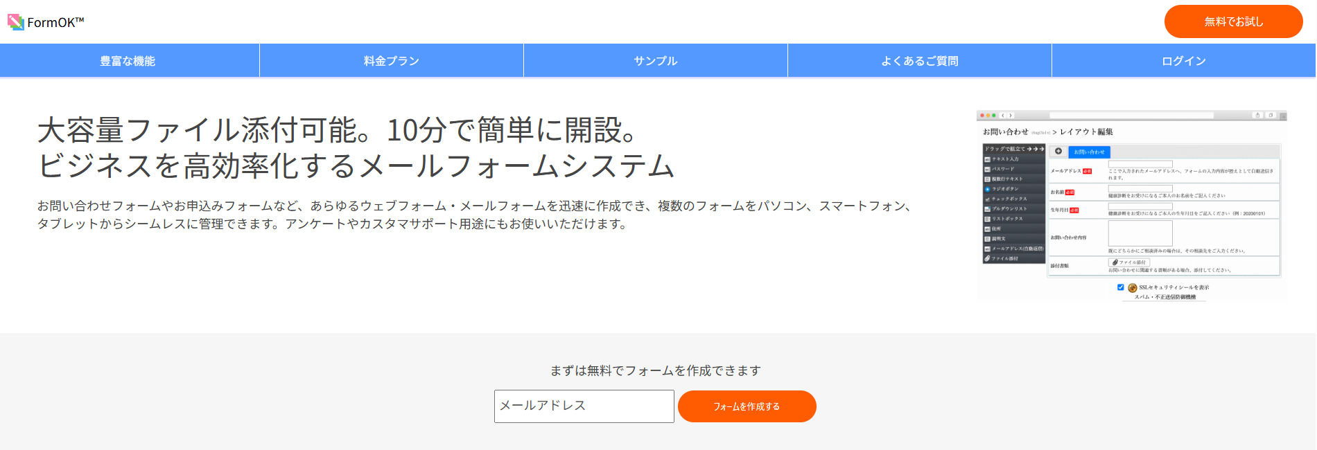 ドラッグ&ドロップの簡単操作でメールフォームを作成でき、SSL暗号化やスパム防止機能も搭載しています。