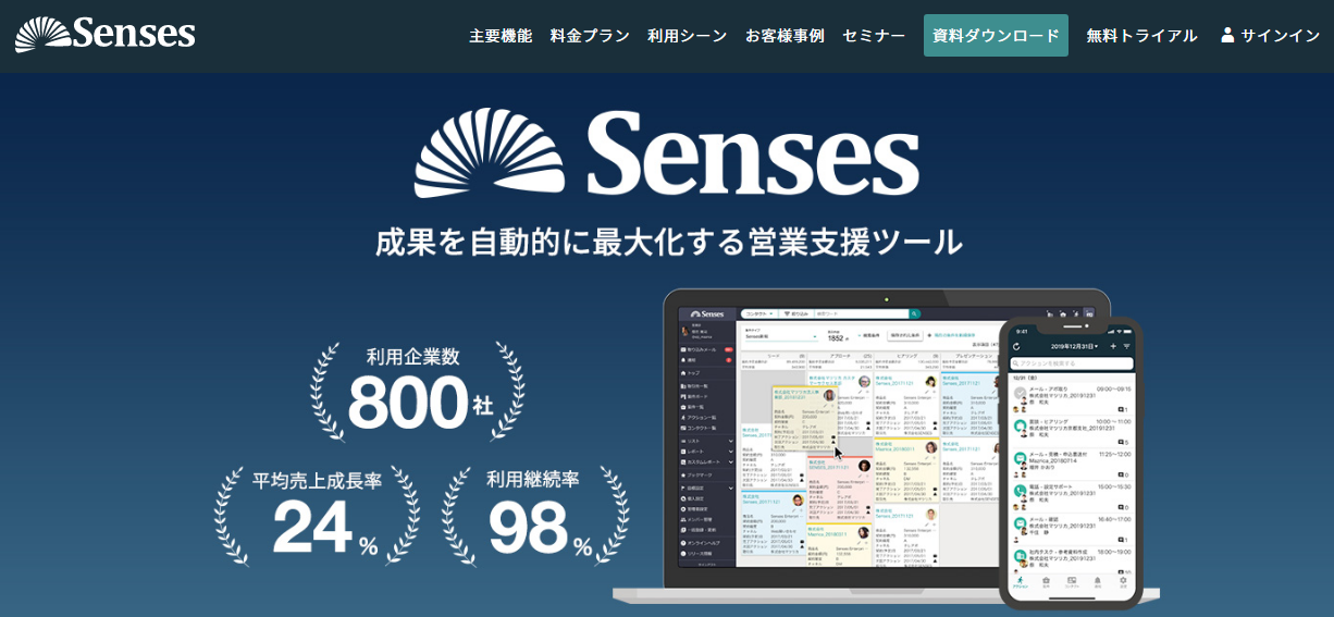 Sensesは、株式会社マツリカの提供するSFAツールです。株式会社PR TIMESや資生堂など800社以上に導入されており、利用継続率98%を誇ります。