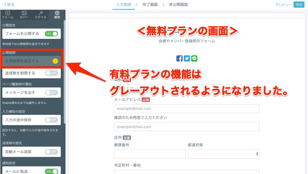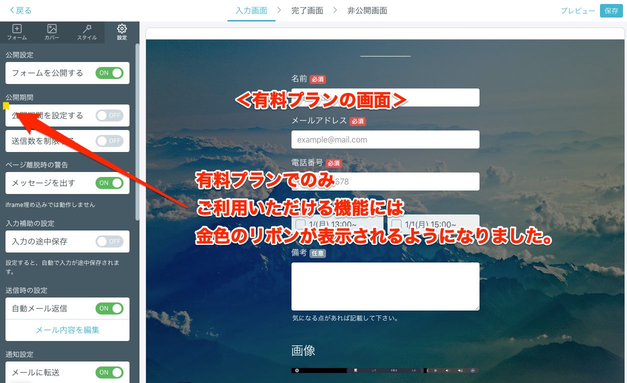 フォーム編集画面では、ご利用中のプランにかかわらず、全ての機能が表示されています。しかし無料プランをご利用の方は、使える機能の範囲をひと目で確認できない仕様となっていました。