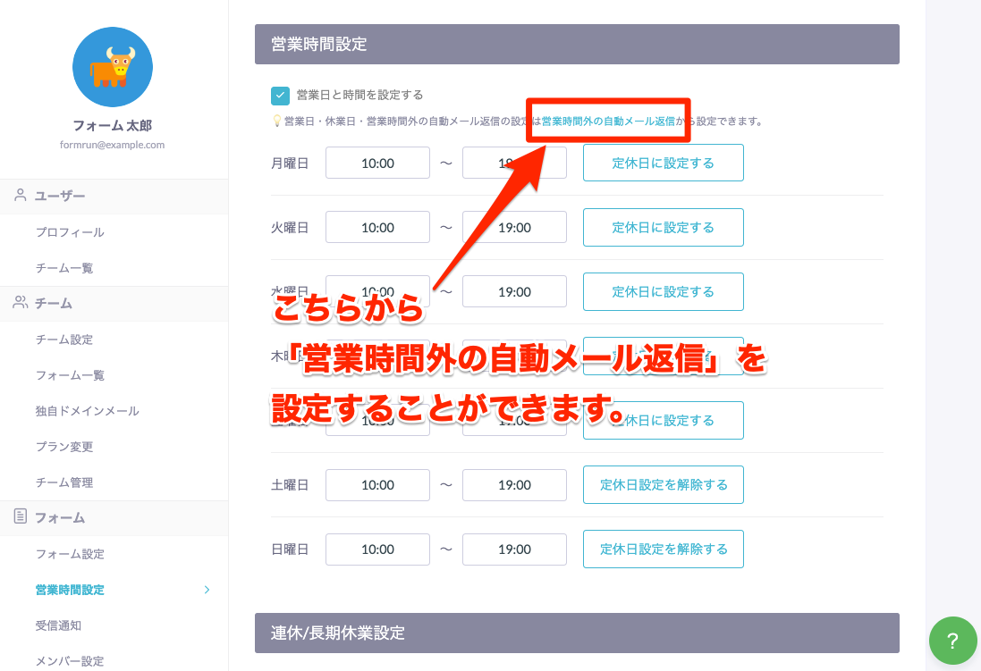 「営業時間設定」「営業時間外の自動メール返信」の導線追加