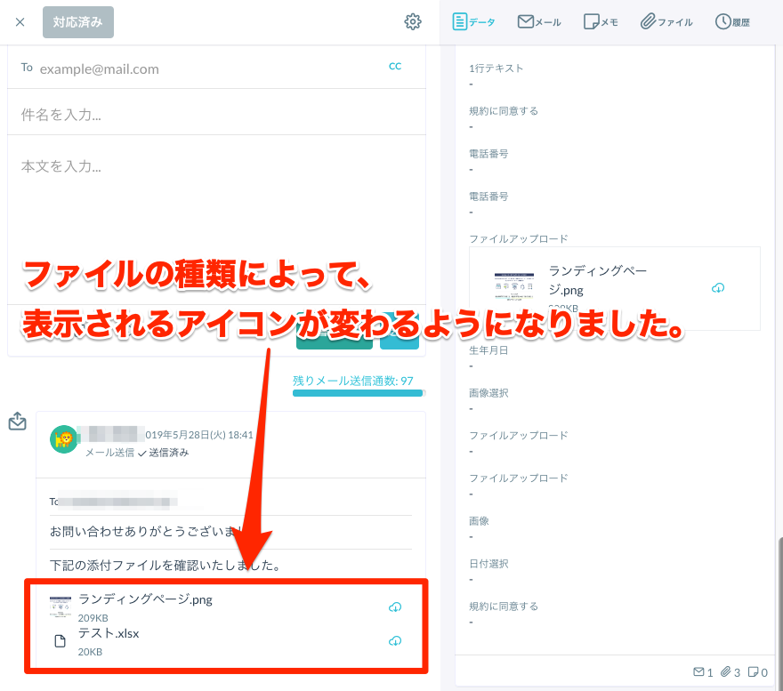 そこで今回、画像時とデータ時で別のアイコンが表示されるように変更いたしました。アイコンをクリックしても、別タブで開かない場合は、添付ファイルがデータの場合がございますので、確認してみてください。
