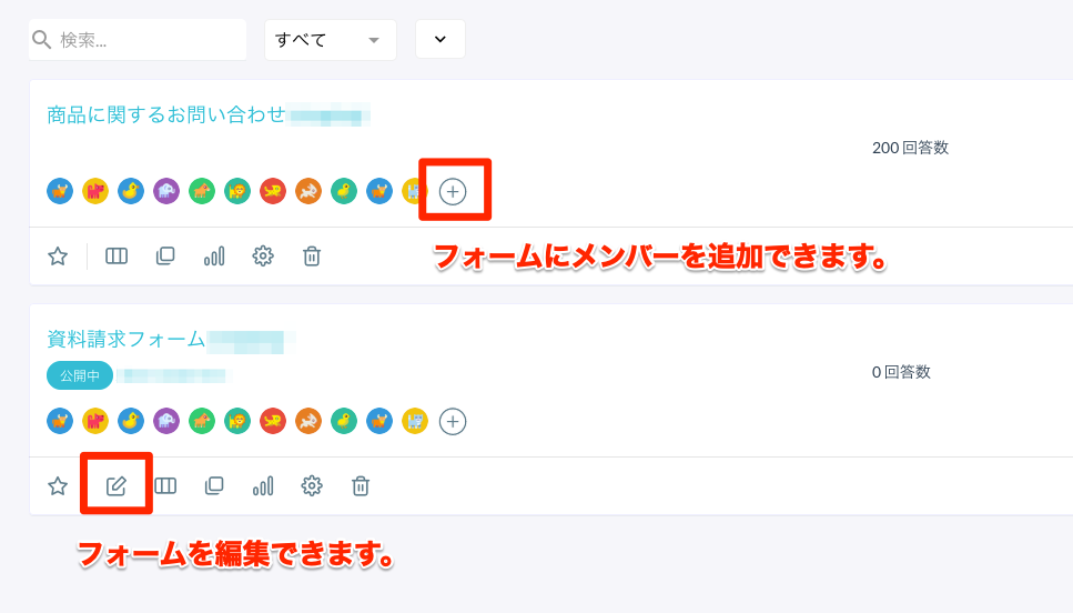 「フォームメンバー」は設定画面に入れないため、このようなお問い合わせが相次いだと仮定し、フォーム一覧画面のアイコンを整理し、メンバー追加の導線を設けました。
