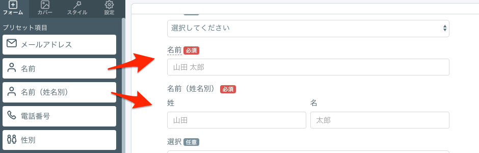 姓と名で別にデータを収集したい場合は、「名前(姓名別)」コンポーネントをご利用くださいませ。