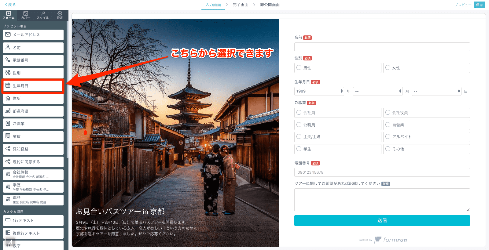 フォームクリエイター左にあるメニューの「プリセット項目」に並んでいます。