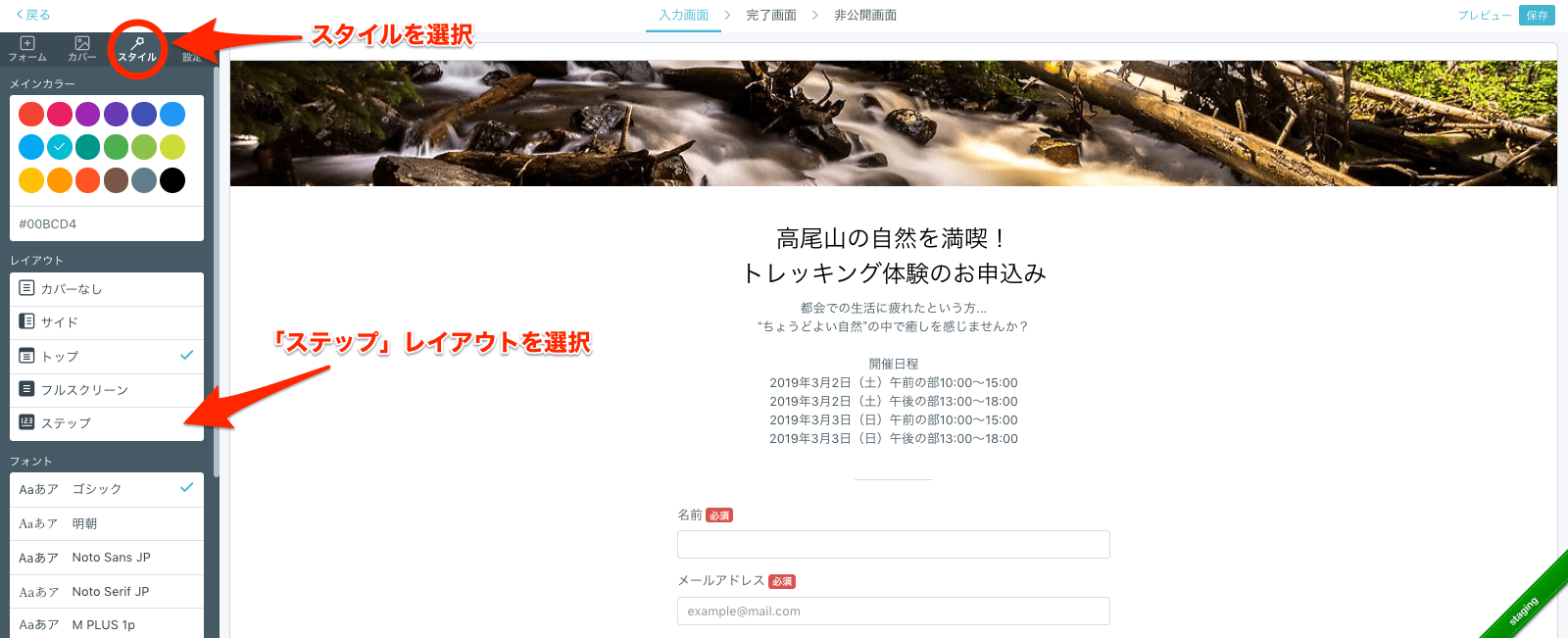 使い方は簡単。フォームクリエイター左のメニュー【スタイル】から、レイアウトで「ステップ」を選択するだけです。
